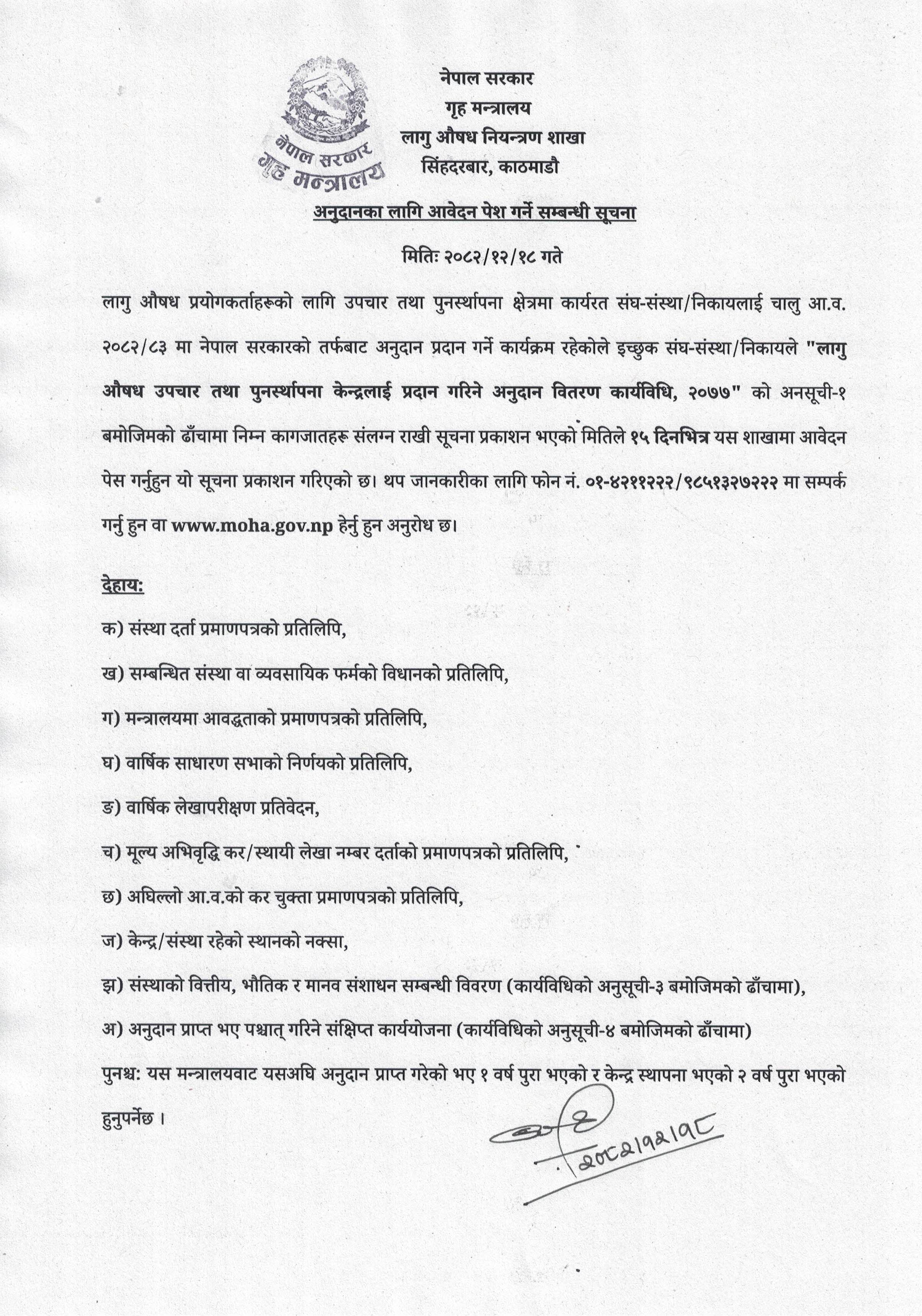 गृह मन्त्रालय, लागु औषध नियन्त्रण शाखाबाट "लागू औषध उपचार तथा पुनःस्थापन केन्द्र" लाई अनुदानका लागि आवेदन पेश गर्ने सम्बन्धी सूचना ।