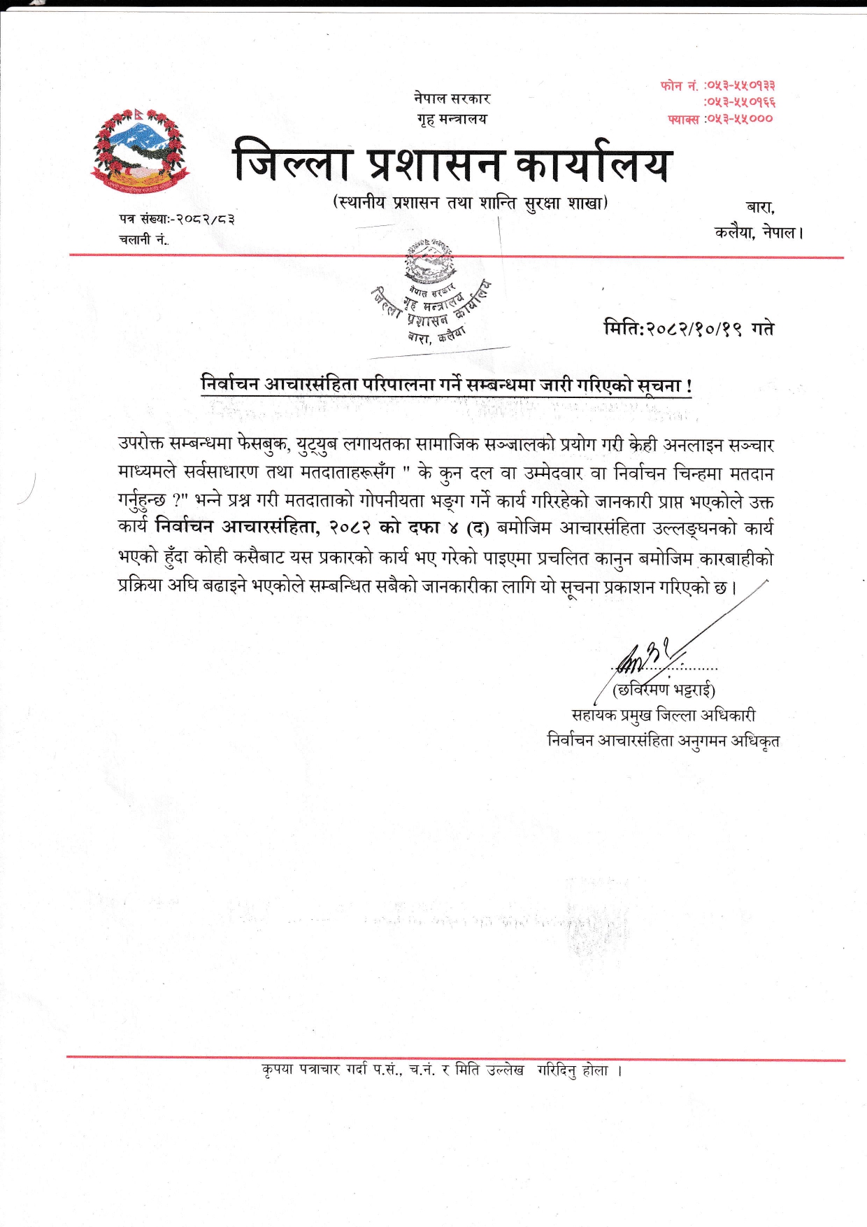 निर्वाचन आचारसंहिता परिपालना गर्ने सम्बन्धमा जारी गरिएको सूचना ।