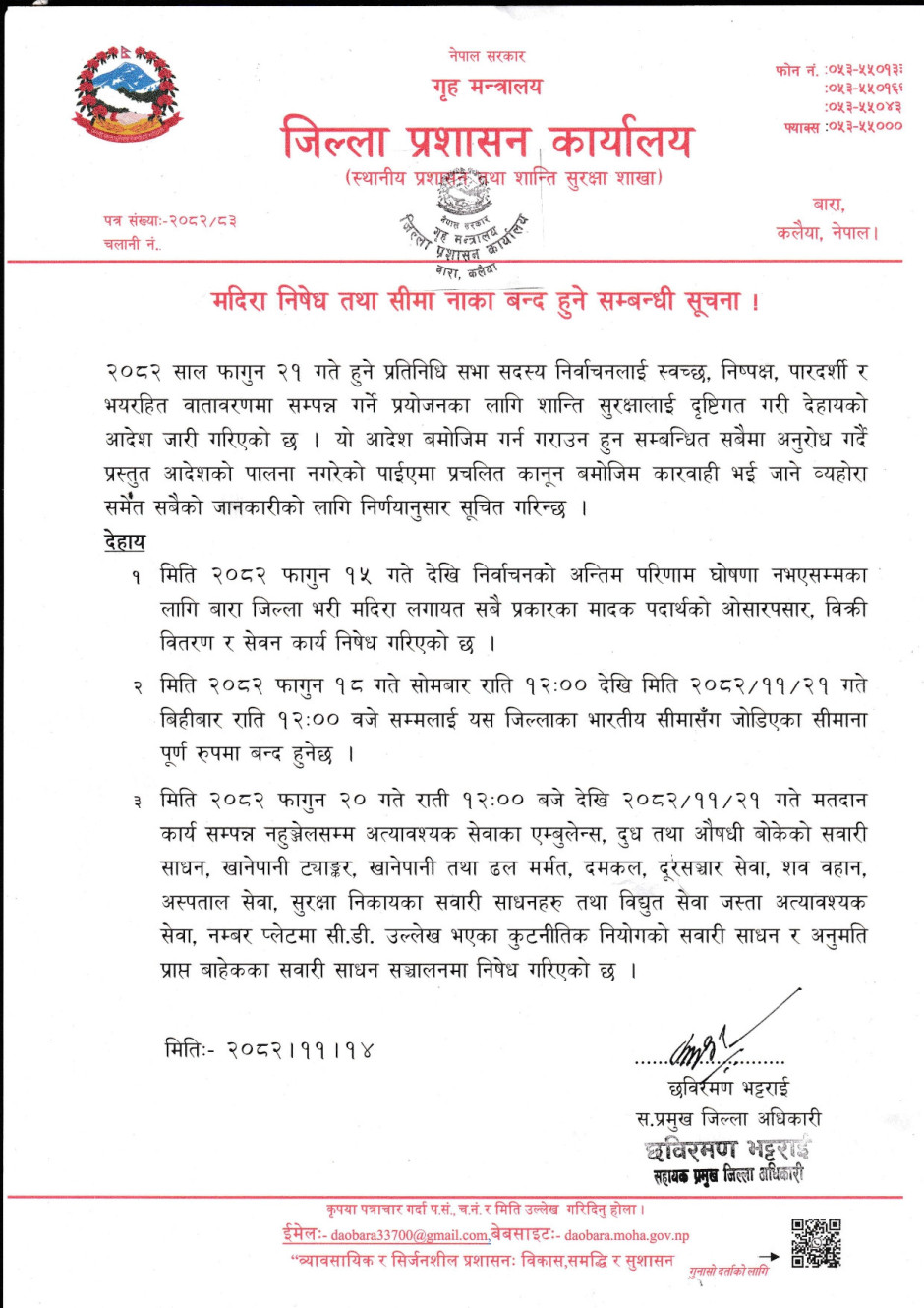 मदिरा निषेध तथा सीमा नाका बन्द हुने सम्बन्धी सूचना !